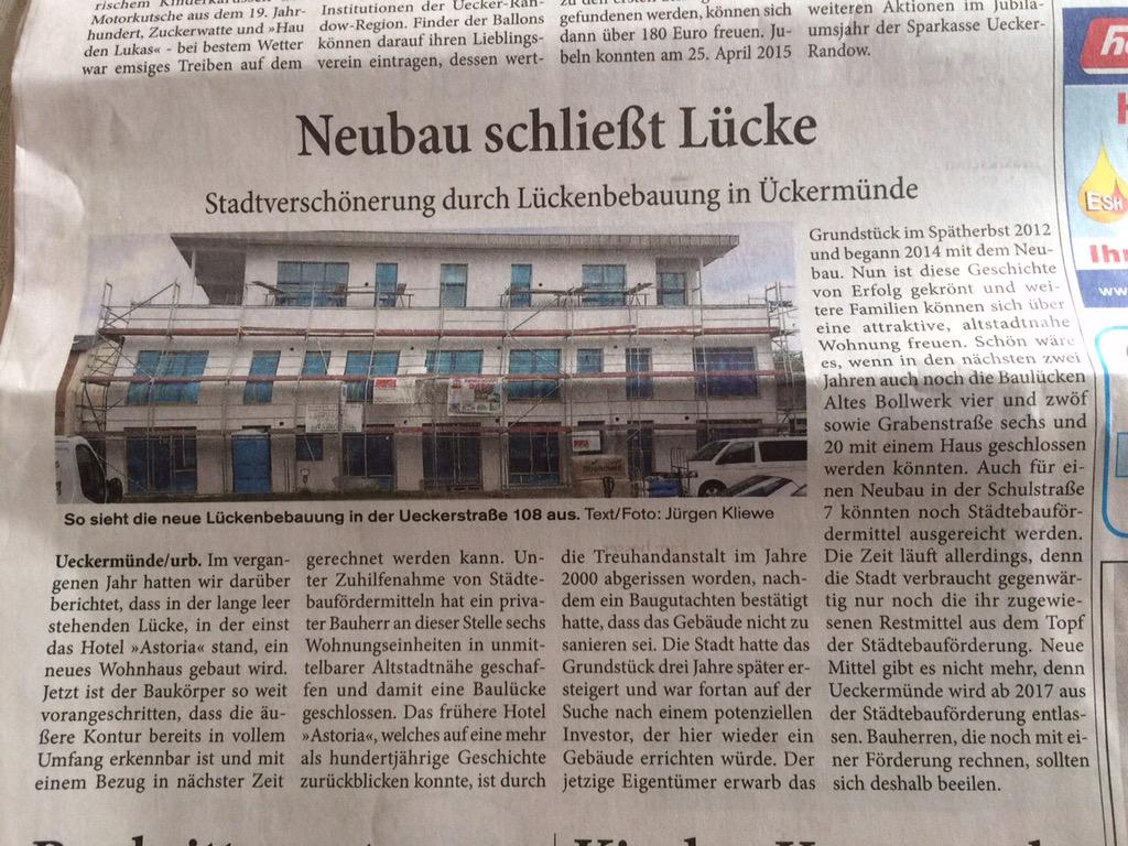 Neubau schließt Lücke. Stadtverschönerung durch Lückenbebauung in Ueckermünde. Modernes Mehrfamilienhaus, mit Blick auf die Uecker. Konzept, Entwurf, Architektur, Planung und Ausschreibung: Büro für Bautechnik – Andreas Carduck